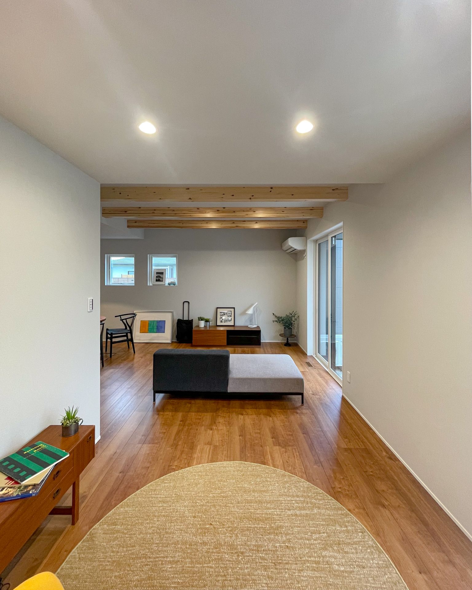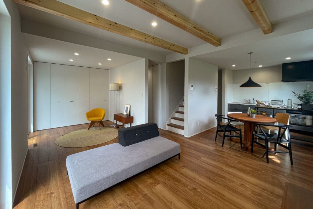 リビングは梁を見せ、開放的ながらも木のぬくもりが感じられる