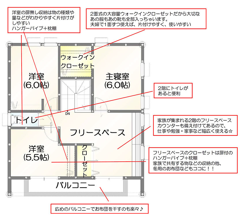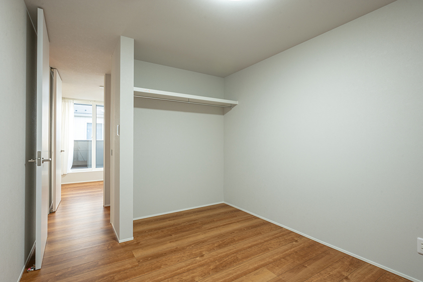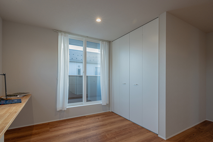 2階洋室の収納は扉がないので服や物の出し入れがスムーズ。持ち物の量がわかるので買い過ぎ防止にもなるかも・・・