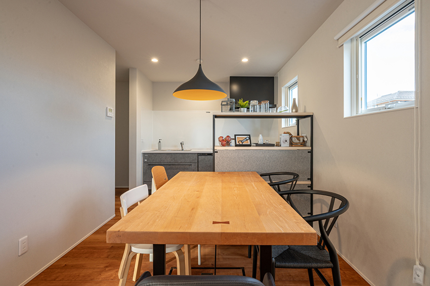 壁付けキッチンで開放感のあるダイニングスペース