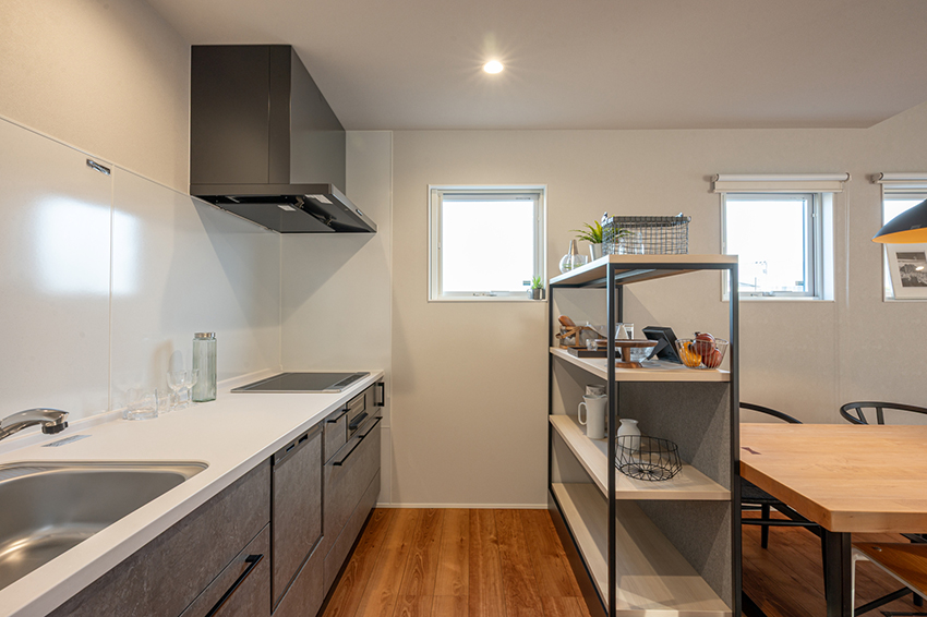 グレーを基調としたオシャレなキッチン、シンクはステンレス製でお掃除簡単(食洗器付)