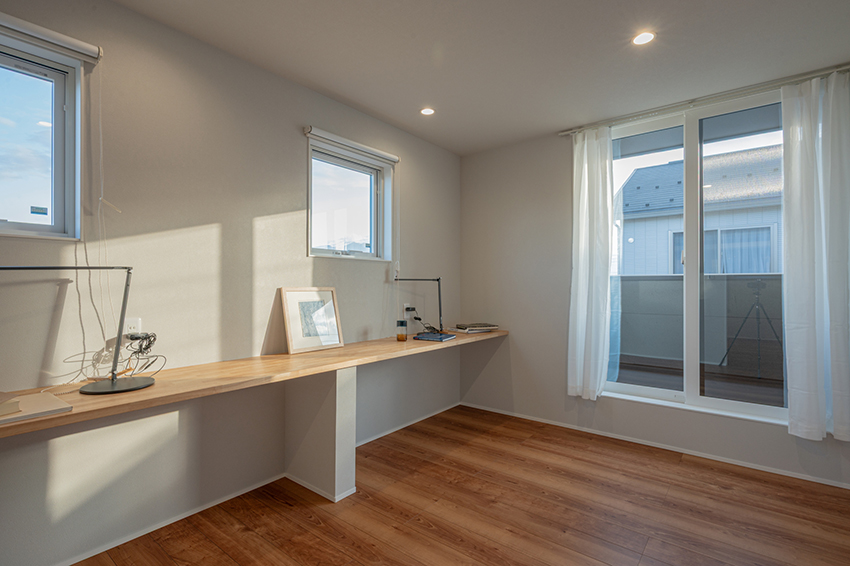 2階フリースペースにカウンターを設置、勉強や読書、家事スペースとしても使用できる